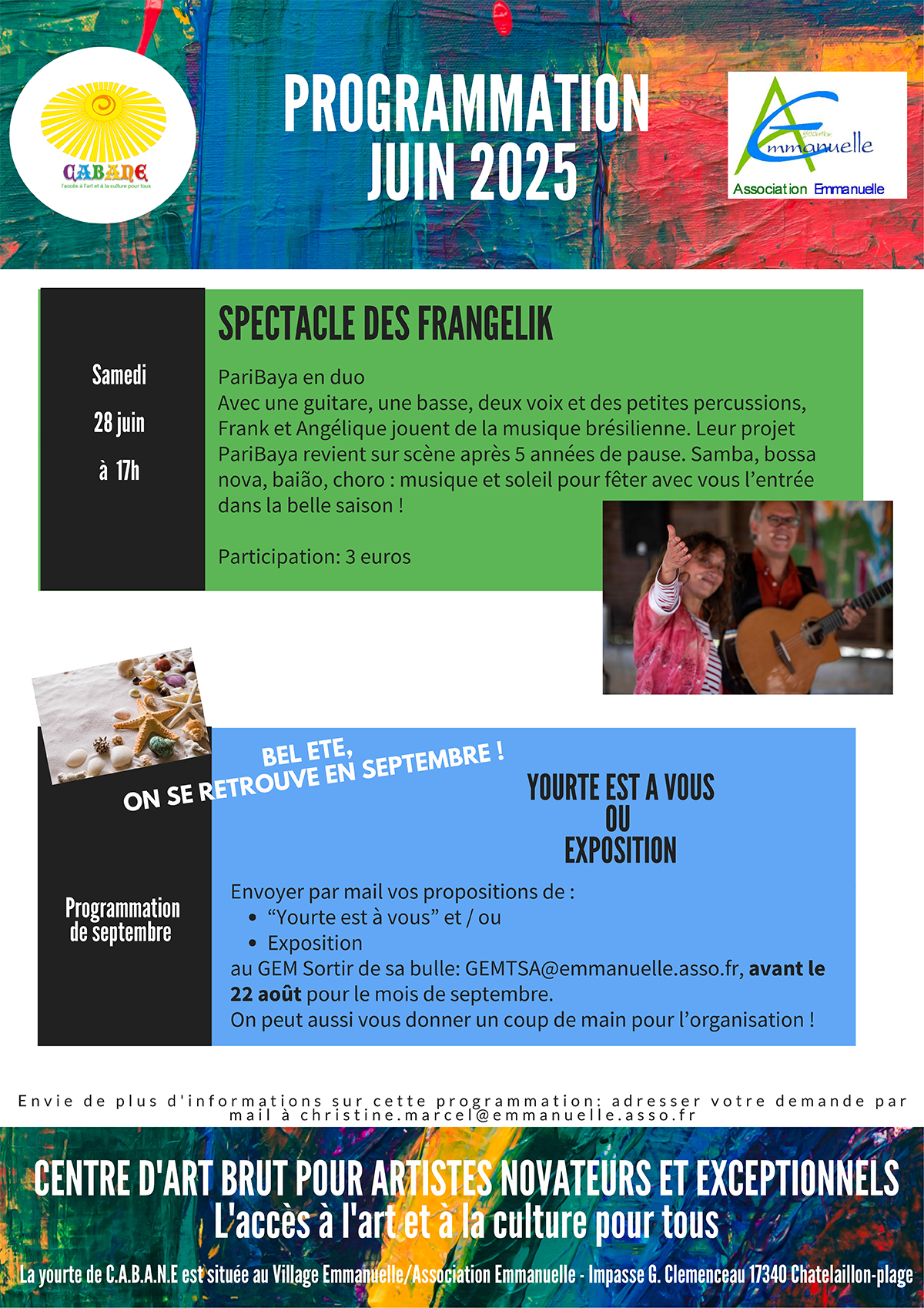 CABANE – Programmation juin 2025 Centre d’Art Brut pour Artistes Novateurs et Exceptionnels La yourte de C.A.B.A.N.E est située au Village Emmanuelle/Association Emmanuelle – Impasse G. Clemenceau 17340 Chatelaillon-plage Navigation articlePrécédent Article précédent :L’ESAT MONTANDON organise une brocante vide-grenier le 22/06/2025SuivantArticle suivant :Inauguration de la Résidence Accueil Emmanuelle le vendredi 27 juin 2025 à 15 h 30