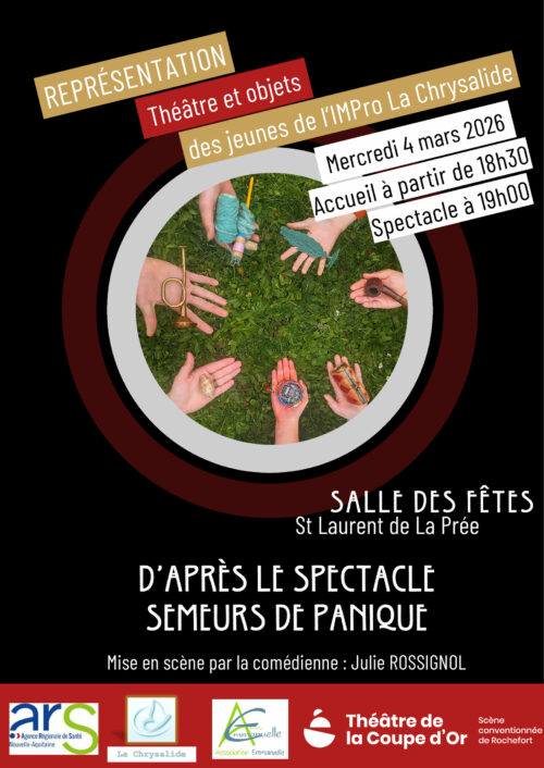 Mercredi 4 mars 2026 Les jeunes de l’IMPro La Chrysalide montent sur scène pour une représentation « théâtre et objets » mise en scène par la comédienne Julie ROSSIGNOL d’après le spectacle « Semeurs de panique ». ils seront heureux de vous accueillir à partir de 18h30 à la salle des fêtes de Saint Laurent de la Prée pour un début de spectacle à 19h. Ce spectacle s’inscrit dans le cadre d’un appel à projet « Culture santé » de l’ARS et en partenariat avec le théâtre de la Coupe d’Or de Rochefort ENTRÉE GRATUITE – inscription obligatoire avant le 13 février midi, via l’adresse mail suivante: improlachrysalide@emmanuelle.asso.fr Navigation articlePrécédent Article précédent :REMISE DE MEDAILLES DU TRAVAIL