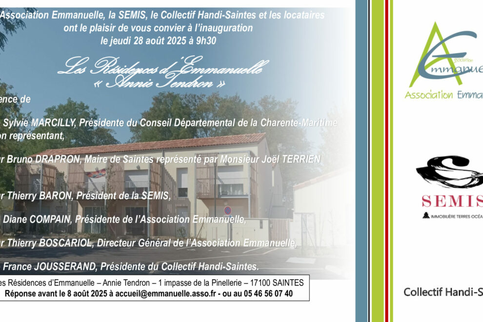 Le 28 août 2025 à 9h30, l’Association Emmanuelle, la Semis et le Collectif Handi Saintes vont inaugurer la Résidence Emmanuelle « Annie Tendron » à Saintes. Cet habitat inclusif a ouvert ses portes le 2 décembre 2024