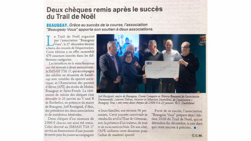 en remerciement de leur partenariat pour l’organisation du trail nocturne du 27 décembre à Beaugeay qui a réunit environ 500 coureurs.