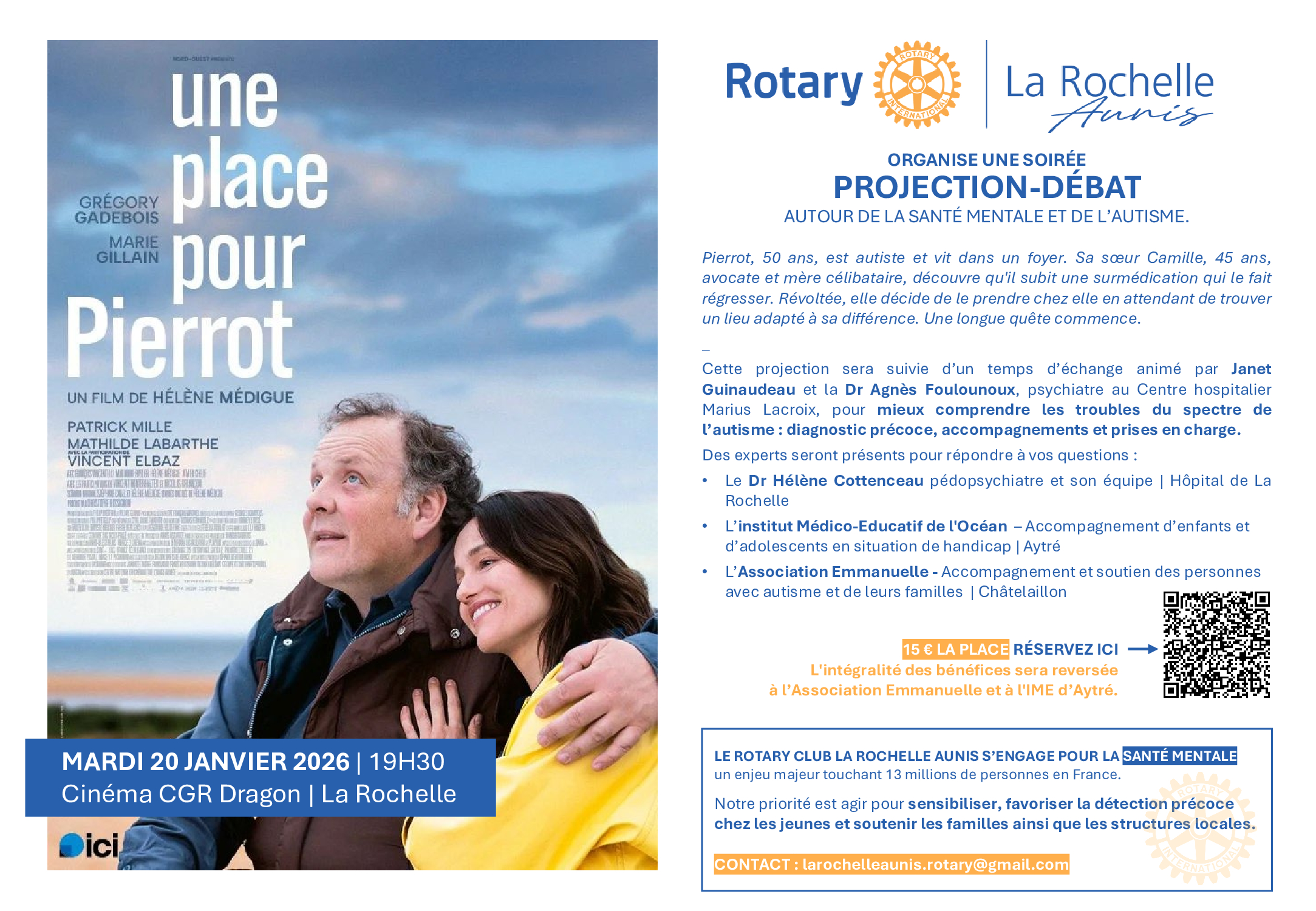 Le Rotary Club La Rochelle Aunis a organisé une soirée placée sous le signe de l’écoute et de la solidarité avec une projection-débat dédiée à la santé mentale et à l’autisme autour du film touchant : « UNE PLACE POUR PIERROT » de la réalisatrice Hélène MÉDIGUE.